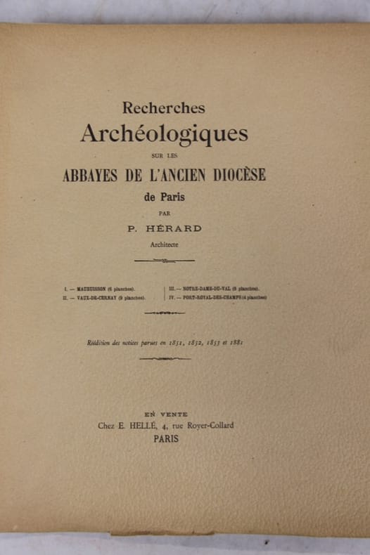 Ouvrage précédée d'une notice biographique sur Louis-Pierre Hérard (1815-1899), architecte, à qui l'on doit les plans des abbayes de Maubuisson, Vaux-de-Cernay, Notre-Dame-du-Val et Port-Royal-des-Champs qui font l'objet de cette monographie. Il reçut la médaille d'or du Salon en 1851. Très minime déchirure à la couv. inf., pâles rousseurs en marge de qq. pl., bel exemplaire. - Frais de port : -France 6,9 € -U.E. 11 € -Monde (z B : 18 €) (z C : 31 €)