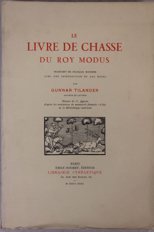 Transcrit en français moderne avec une introduction et des notes par Gunnar Tilander - Vol. I de la collection Les Maitres de la Vénerie. Emile Nourry, Paris, 1931. In-4 p., bross. orig. (tracce d'uso, dorso restaur.), pp. XXVIII,204, con la riproduzione, nel t., di 51 miniature tratte dal codice francese 12399 della Bibliothèque Nationale, oltre a qualche vignetta e finalino. Prima edizione in francese moderno.Cfr. Thiébaud, p. 401: L'introduction est une remarquable étude sur tous les manuscrits du "Roy Modus", les éditions anciennes, la date de composition du livre et, enfin, sur l'énigme du nom de l'auteur. Tiratura di 1000 esempl. numerati sur alfa satiné. Il ns., 443, è intonso, ben conservato.