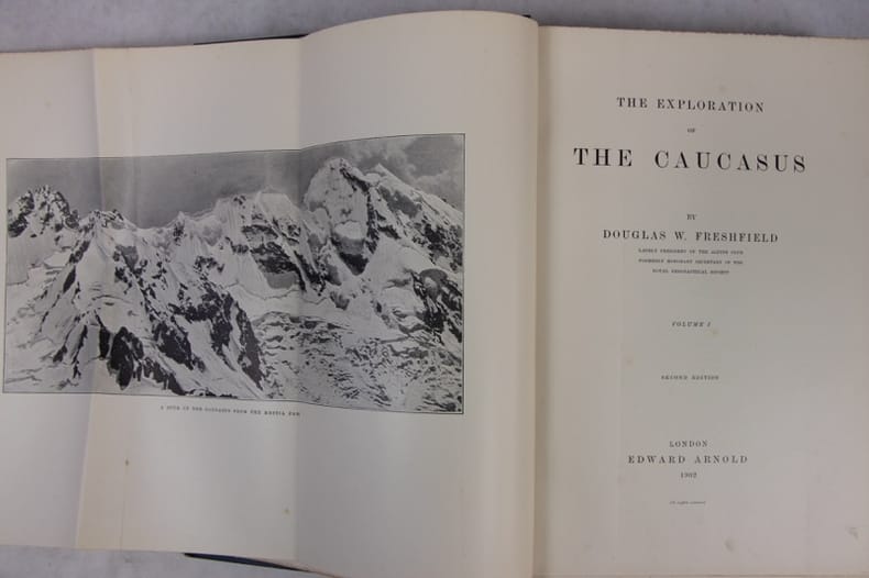 Seconde édition. Au cours de trois voyages, en 1868, 1887 et 1889, Freshfield, l'un des plus célèbres représentants de l'alpinisme britannique, traversa la chaîne principale du Caucase onze fois par huit passages différents. Il a participé à l'ascension de trois des grands sommets, Elbruz, Kasbek et Tetnuld. Il donne aussi le récit des ascensions d'autres pics par plusieurs de ses amis du Club alpin : H. Wooley, J.G. Cockin, et H.W. Holder. Très bon état d’occasion