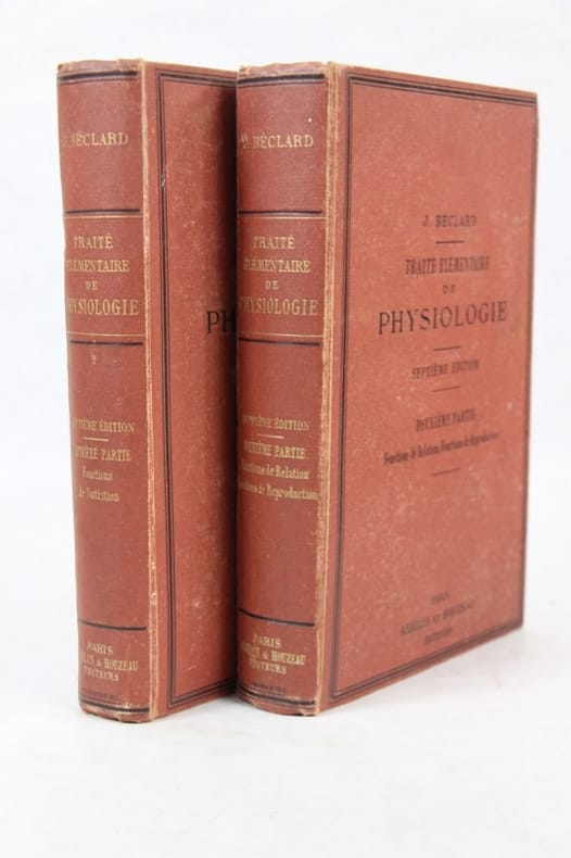 Paris, Labé, 1856, in-8, de X, 1123 et (1) pages, demi-percaline mauve de l'époque, dos à 4 nerfs orné, Rare seconde édition, après une première parue en 1855. Dans la veine de la grande école médicale française héritée de Bichat, Jules Béclard, fils de Pierre-Augustin Béclard (dont il réédita certaines des oeuvres) propose avec ce présent traité, une somme monumental de la physiologie de son époque. Quelques faibles rousseurs, sinon bon exemplaire. Couverture rigide