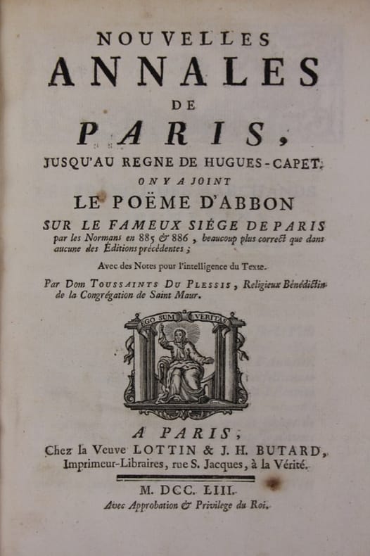 Ed. orig. Du Plessis (1689-1767), Dominicain de l'Abbaye de Saint-Maur fut nommé bibliothécaire de l'abbaye de Saint-Germain. Nous lui devons cette chronique du Haut Moyen-Age qui s'inscrit dans les travaux des mauristes réputés pour leur sens critique et leur rigueur, remarquable étude sur les écoles de Paris sous le régne de Charlemagne. Très fouillé et minutieux appareil critique en français du poëme d'Abbon de Saint-Germain-des-Prés (850-922), principale source historique sur cette expédition guerrière des Vikings contre la capitale. (Dufour, 184).