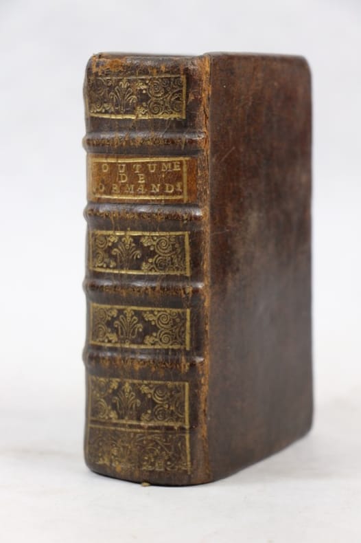 Avec des Extraits Sommaires des Edits, Déclarations, Ordonnances & Arrêts concernans les Mariages : Et d'une Table des Matières, tant pour la Coutûme, que pour les Articles placitez, Nouvelle & dernière Edition, 1 vol. petit in-12 reliure de l'époque pleine basane marron, dos à 4 nerfs, Chez Jean-B. Besogne, Rouen, 1732, 22 ff., 652 pp. et 18 ff. n. ch. Rappel du titre complet : Coutumes du Pays et Duché de Normandie, Anciens Ressorts & Enclaves d'icelui, augmentées de plus de moitié, par plusieurs Edits, Déclarations, Arrets & nouveaux Règlemens, tant du Conseil que de la Cour, rendu jusqu'à présent, comme il est marqué en la Table du Recueil à la suite de celle des Titres ci-après ; & en outre, les Articles rectifiez par les Textes d'Aviron & de Berault.
