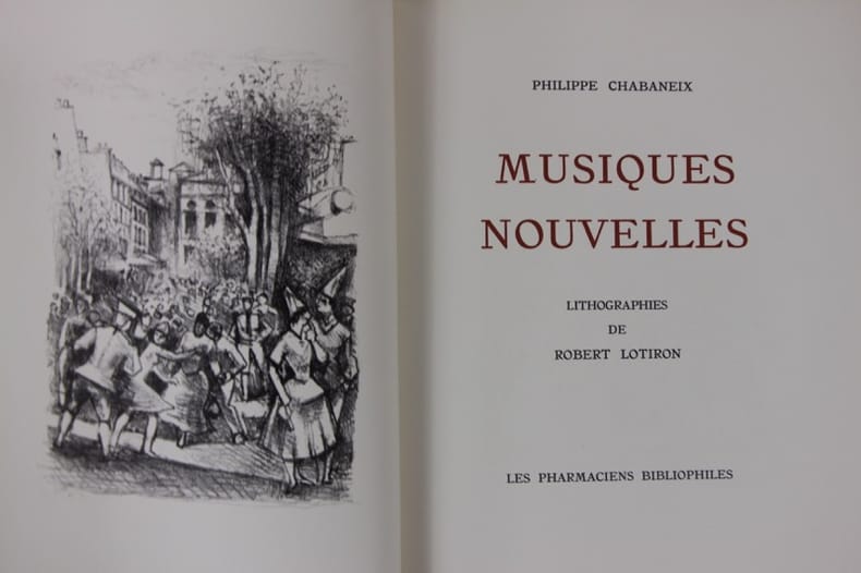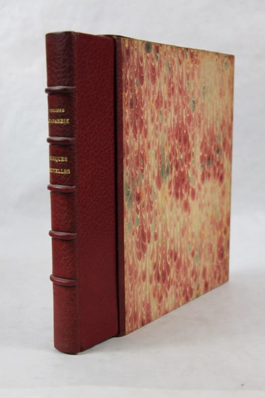 Les Pharmaciens bibliophiles 1958 In-4, demi-maroquin à grains grenat à bandes vélin crème, dos à nerfs, tête dorée, couvertures et dos conservés, étui bordé fendillé en pied, 111 pp. 32 lithographies hors-texte. Bel exemplaire.