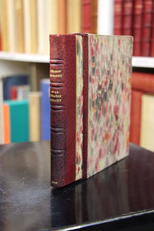 Rodez, Jean Subervie 1959 In-16, plein maroquin grenat, dos à nerfs, filet en coupes, tête dorée, contreplats de maroquin vert, gardes de soie, doublure et étui bordé, couvertures et dos conservés Legendre, 31 pp. Bel exemplaire.