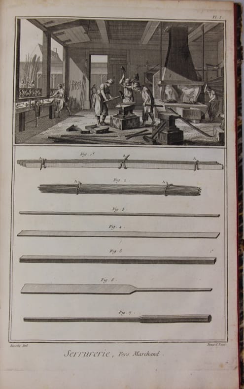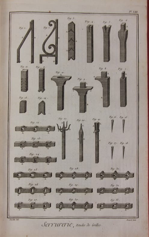 Ouvriers au travail, fers, gros fers, cadenas, loquets, charnières, heurtoirs, clefs, serrures de portes, d'armoires, de tiroirs, boutons, moulures, croisées, persiennes, rampes, grilles, stors. ornements, brasures, espagnoletes, ferrures de voiture, outils de forge. Bon état d’occasion Livres à planches