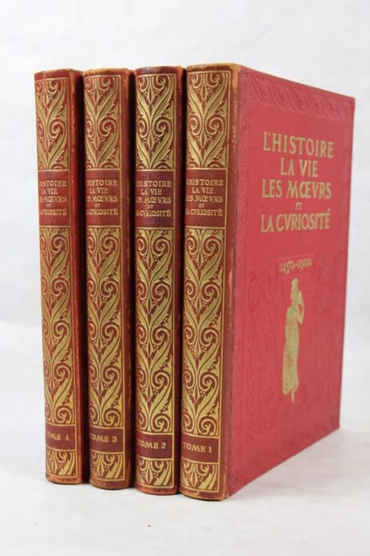 Paris Librairie de la curiosité et des beaux-arts 1927 in-4. 1927. relié. 1928. Complet en cinq volumes In-4 (311x230 mm). Livres reliés Demi-Cuir à coins Dos ornés de motifs dorés Tranches supérieures dorées. L'histoire la vie les moeurs et la curiosité par l'image le pamphlet et le document (1450-1900).Importante iconographie en noir en couleurs et en bichromie.Reliures en état correct avec des frottements notamment aux coins et aux coupes avec deux pièces de titre et une pièce de tomaison manquantes. Intérieurs propres un peu jaunis. Poids : 12640 gr