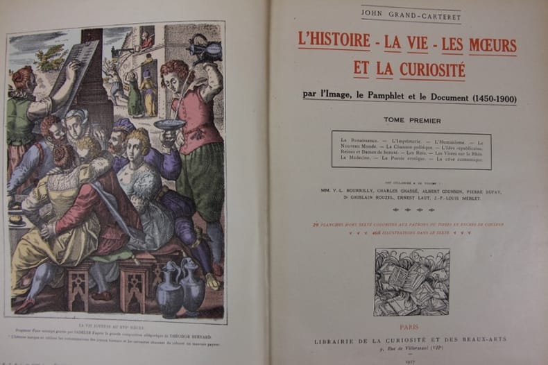 Tome I : La Renaissance, L'imprimerie, L'humanisme, Le Nouveau Monde, La chanson politique, L'idée républicaine, Reines et dames de beauté, Les rois, Les visées sur le Rhin, La médecine, La poésie érotique, La crise économique. Tome II : La réforme en Allemagne et en France, Les guerres civiles et religieuses, Les grandes figures du XVI siècle, Les superstitions, Le théâtre, La vie galante et la vie rustique, Les premières éditions de la Renaissance, Epidémies et grands fléaux, Curiosités diverses. Tome III : Henri IV, La fronde et les mazarinades, Abraham Brosse et l'esprit frondeur, Les étrangers en France (italiens et espagnols aux XVI et XVII siècles), Le droit des gens, Les précieuses, Nos grands classiques, Jésuites et jansénistes, Le théâtre, Les médecins de Louis XIV, La mort du lion, La table et l'alcôve du grand Roy, La régence, La banque Law, Curiosités diverses. Tome IV : La franc-maçonnerie, Un centre d'enseignement médical sous l'ancien régime, La particule nobiliaire, Les encyclopédistes, Les femmes au pouvoir, Les auteurs galants, Le magnétisme, Les expéditions lointaines, Le théâtre, Les Gazetiers et pamphlétaires, L'envers du Consulat et de l'empire, La restauration, Curiosités diverses. Tome V : La révolution de 1830 et le gouvernement de juillet, La révolution de 1848 et la seconde république, Le Second Empire et la spéculation nationale, Le XIX siècle galant, Le mouvement philosophique, La Commune et la troisième république, Les présidents et la caricature, Le boulangisme et L'affaire Dreyfus, Une idée des affaires sous la troisième république, Les monographies.