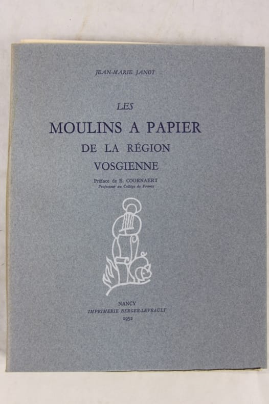 Une somme historique, économique et sociale, sans nule doute exhaustive, puisée aux archives départementales des Vosges, notamment notariales et dans les archives privées de la Papéterie de Lana à Docelles, et de la famille Krantz. Précieuse carte de la répartition des moulins à papier de la région et nombreuses pièces justificatives. Préf. de E. Coornaert. Tiré à 600 ex. num. sur chiffon, vergés et vélins de Lana. Très bon état d’occasion