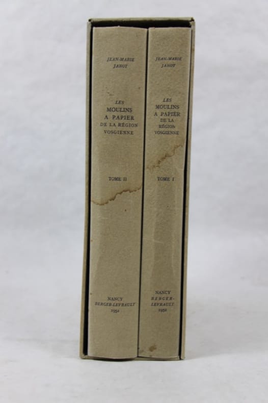 Préface de E. COORNAERT, 2 tomes en 2 volumes in 4 en feuillets, couverture cartonnée, de couleur gris bleu, à rabats, avec titre au dos et sur les plats. Pagination continue, non coupé. Tome 1 1 page additions et corrections, faux-titre, titre, XL, 199 pages, 1 portrait de Catherine ANCILLON épouse de Dominique Nicols KRANTZ maître papetier de Dinozé . Tome 2 faux-titre, titre pages 200 à 524. Nombreuses reproduction de filigranes vosgiens en blanc sur papier gris bleu. . Cet ouvrage réalisé par des Lorrains, dans un esprit de désintéressement absolu, a été tiré à 600 exemplaires. Les papiers de chiffon à la forme vergés et vélins ont été fabriqué spécialement par les papeteries de LANA à DOCELLES- Le filigrane de Saint Antoine, ermite, patron des papetiers vosgiens a été dessiné par GEO CONDE. . Achevé d’imprimer à Nancy sur les presses de BERGER LEVRAULT le 11 mai 1952. Exemplaire n° 465. Etui cartonné. Très bon état