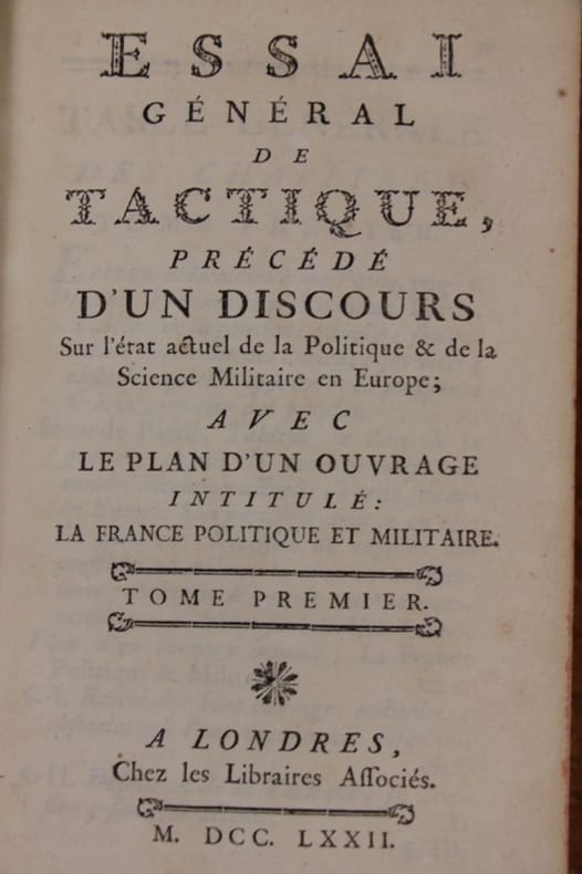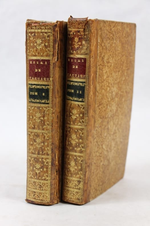 Paru sous l’anonymat en 1770 cet ouvrage révolutionnaire souleva de nombreuses critiques par ses considérations sur l'armée française, déclarée inférieure à l'armée prussienne. Guibert (1743-1790) sera l'un des principaux collaborateurs du comte de Saint-Germain pendant son ministère (1775-1777), et l'artisan de ses réformes, notamment du règlement d'exercice et de manœuvre de 1776. Son oeuvre a eu une grande influence sur les conceptions militaires de Napoléon. Bon état d’occasion