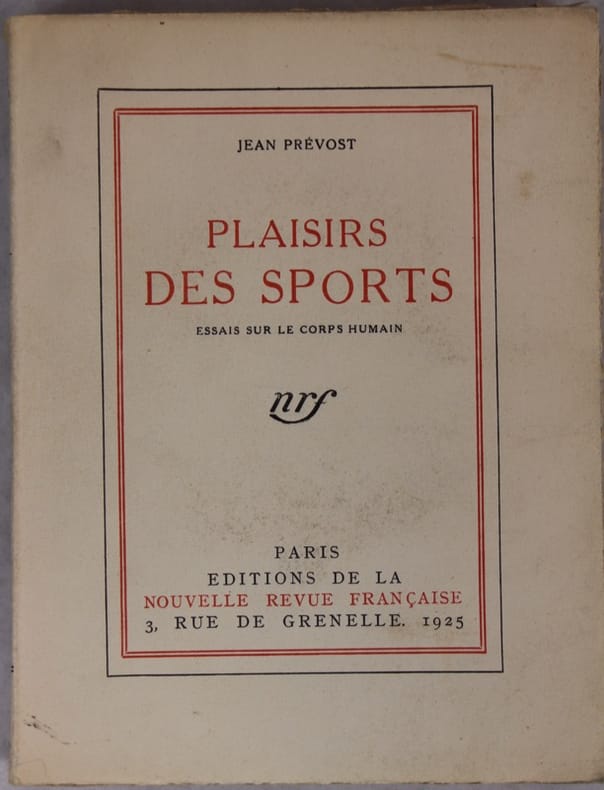 Jean Prévost (1901-1944) écrivain, journaliste et résistant français fusillé par les nazis. Cet ouvrage est un hymne au sport: éducation, plaisir, combat sans arme, escrime, vitesse pure, jeux d'équipes, de la tête et du pied, les champions, le loisir etc..