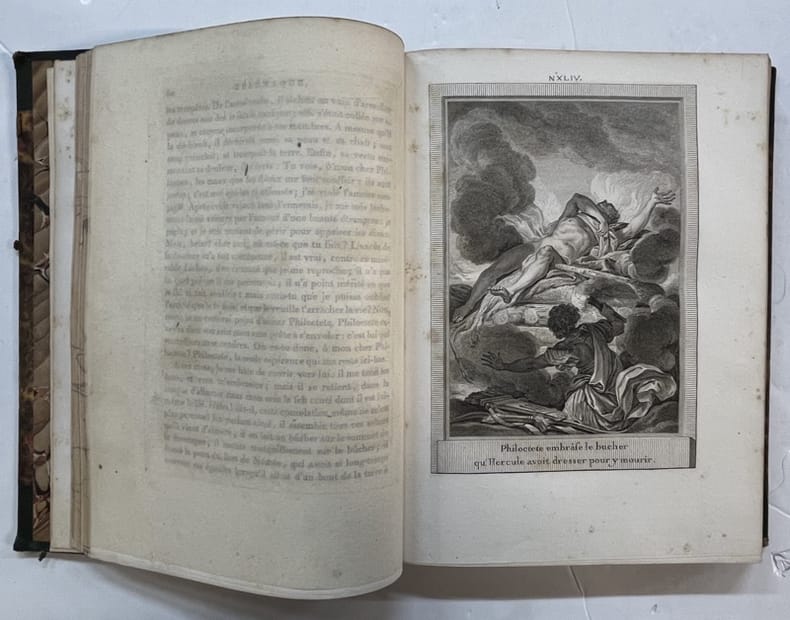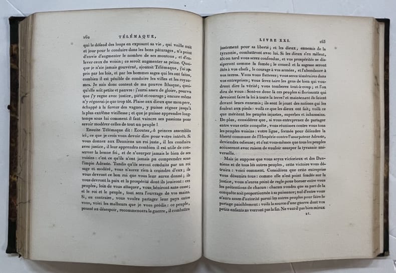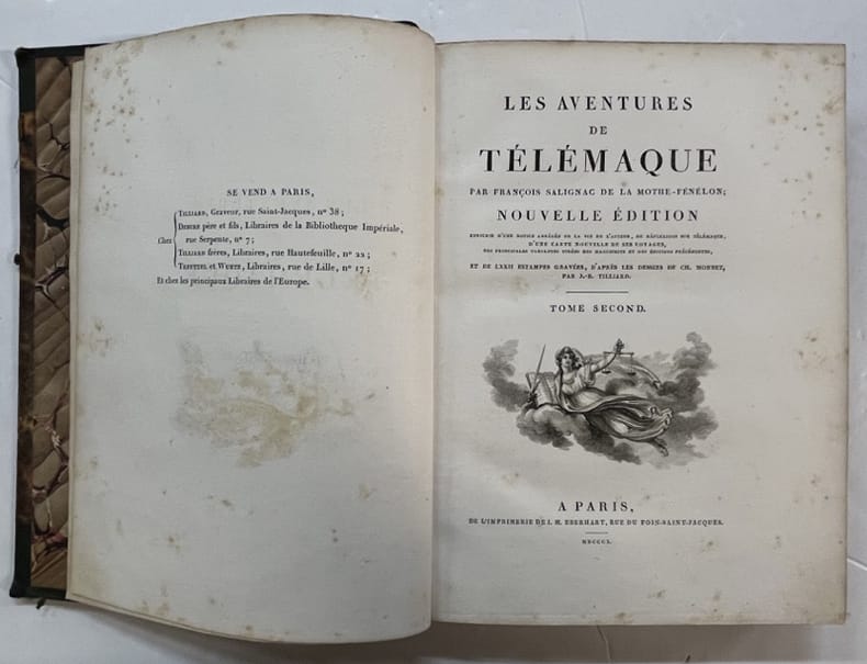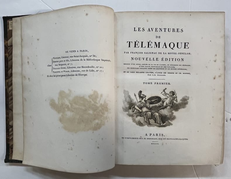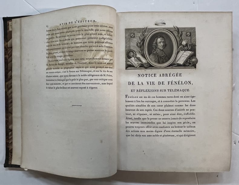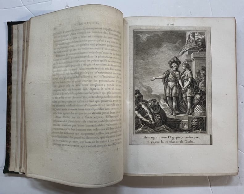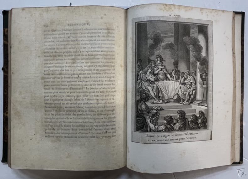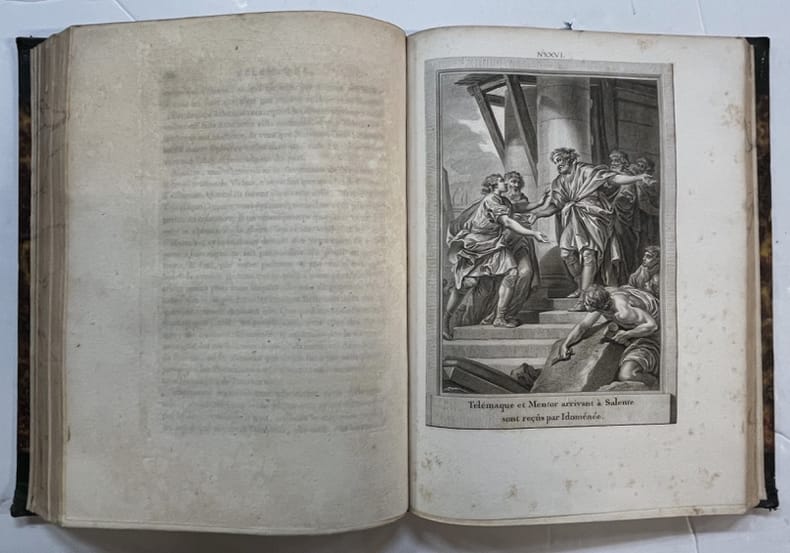 Fénelon (1651-1715) , le Cygne de Cambrai, est considéré aujourd’hui, avec “Les Aventures de Télémaque” comme un précurseur du siècle des Lumières. Précepteur du duc de Bourgogne, archevêque de Cambrai (1695-1715), il s'opposa à Bossuet et tomba en disgrâce lors de la querelle du quiétisme, et surtout, après la publication de son roman, Les Aventures de Télémaque (1699), considéré comme une critique de la politique de Louis XIV. L'influence littéraire de ce roman fut considérable pendant plus de deux siècles. Les Aventures de Télémaque sont à la fois une épopée et un traité de morale et de politique. Ce roman de 1699 connaît un grand succès jusqu'à la Première guerre mondiale (Aragon et Sartre l'avaient lu dans leur jeunesse). Les “Aventures de Télémaque” furent publiées en 1699 sans l'accord de l'auteur, et réimprimées en 1717 par les soins de sa famille. L'ouvrage a connu une foule d'éditions, a été traduit dans toutes les langues et a même été mis en vers latins (une première fois à Berlin en 1743, une seconde fois à Paris, par Étienne Viel en 1808). Ce roman a provoqué la disgrâce de Fénelon à la cour. Ce dernier avait écrit ce roman d'aventures à l'attention des élèves royaux et en particulier du duc de Bourgogne, le fils du dauphin, dont il était le précepteur. Peintre et dessinateur prolifique, Charles Monnet (1732-1808) est l'un des plus célèbres illustrateurs de la fin du XVIIIe siècle. Bon état d’occasion