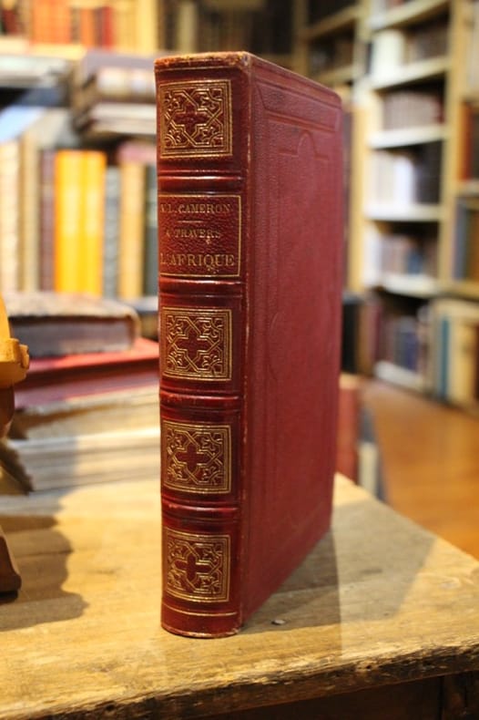 Edition originale de la traduction française ; sous reliure décorative du temps. L'ouvrage recèle une abondante iconographie in et hors-texte et renferme bien in fine la grande carte en couleurs qu'il se doit de contenir. ''Je me suis ici attaché à rendre compte les particularités de ma route, le traits du pays, les moeurs, les coutumes des habitants, à rapporter l'horrible manière dont est pratiqué l'exécrable commerce d'esclaves, à faire connaître la désolation qu'il laisse derrière lui''. ''Entré dans la Royal Navy en 1857, Verney Lovett Cameron participe en 1868 à la campagne d'Abyssinie et lutte contre l'esclavagisme. La Royal Geographical Society lui confie en 1873 la mission de rejoindre David Livingstone et de lui porter assistance.À peine partie, il rencontre la caravane de Livingstone transportant sa dépouille. Il décide alors de continuer son expédition, arrive à Ujiji près du lac Tanganyika et y retrouve les affaires de Livingstone. Il explore la région, découvre Nyangwe, suit le cours du fleuve Congo et atteint l'océan Atlantique le 28 novembre 1875, devenant ainsi le premier européen à avoir traversé l'Afrique d'est en ouest. Table : Arrivée à Aden - Zanzibar - Bagamoyo - Kaolé - Kikoka - Asouhouah - Kisémo - Monts Kougoua - Simmabahouéni - Makata - Réhenneko - Mirammbo - Temmbé - Les Vouadirigo - Ougogo - Kanyényé - Les Vouahoumba - Askari - Ounyanyemmbé - Kasékérah - Hissinéné - Ougara - Sinndi - Ouvinnza - Ougaga - Kaouélé - Cap Koungoué - Rwanda - Mékéto - Pakhânndi - Ouvinnza - Louama - etc. Chadenat, Catalogue de sa bibliothèque, n°3156. Infimes marques d'usage affectant la reliure. Claires rousseurs dans le texte (davantage marquées aux premiers et derniers feuillets). Carte légèrement effrangée présentant en outre une petite déchirure marginale. Du reste, bonne condition.