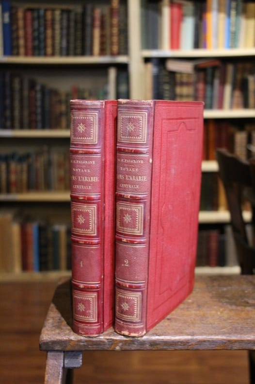Paris, Librairie de L. Hachette et Cie 1866 2 volumes. In-8 23,5 x 15 cm. Reliures demi-chagrin grenat, dos à nerfs ornés de filets à froid, plats restaurés amateur, XVI-346-429 pp., portrait de l’auteur en frontispice, carte repliée de l’Arabie, plan d’Hayel - Plan de Riad, plan du palais de Feysul à Riad, plan d’Hofhoof, tables des matières, tables méthodiques, table des gravures. Abondants soulignements et annotations au crayon à papier, intérieur correct.