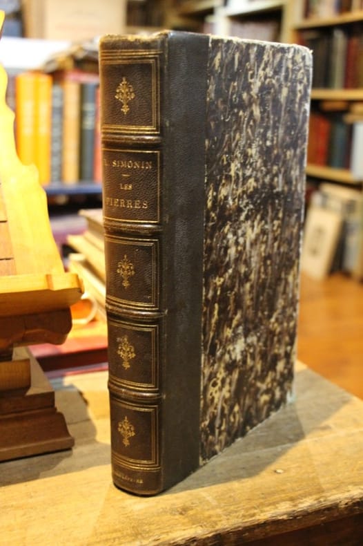 LES PIERRES, Esquisses minéralogiques L.Simonin Ouvrage illustré de 91 Gravures sur bois par Eugène CICERI, E. PETOT, A. MESNEL et E. TOURNOIS.6 Planches imprimées en Chromo-Lithographie sous serpente d'après les Aquarelles de A. FAGUET.15 Cartes tirées en couleur. La tribu des pierres : Etude des pierres. Naissance des pierres. Les pierres de France. Les pierres du globe. Histoire de quelques pierres : L'Or et l'Argent des Montagnes-Rocheuses. Les Marbres d'Italie. Les Mines de l'Ile d'Elbe. Les Houillières de l'Autunois et du Canal du Centre. Minéralogie. Fort volume in-4, 175x190, relié demi chagrin rouge, dos à nerfs, qq rousseurs, toutes tranches dorées, 516pp, superbe ouvrage ! Edition originale Paris Hachette 1869