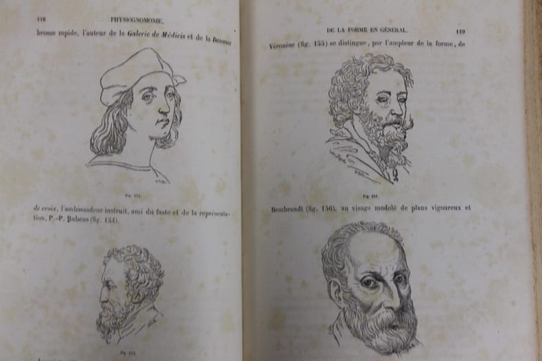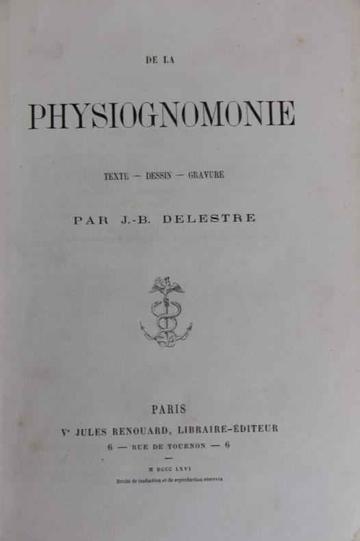 La Physiognomonie est l’ouvrage le plus célèbre de Jean-Baptiste Delestre (1800-1871), polygraphe et théoricien de l’art. “Son objectif, clame-t-il, est d'étudier l'homme, de mieux le comprendre et de tracer un alphabet physiognomonique, afin d'apprendre à lire couramment sur la surface du corps humain, spécialement sur le visage.” Bon état d’occasion