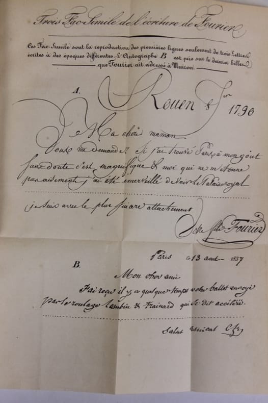 1843 Paris, Librairie de l'Ecole sociétaire 1843, petit in-8,reliure demi veau dos lisse dos frotté,coins usés, XXXII-556 pp., un f. n. ch. d'errata, avec deux fac-similés en dépliant, et avec la planche hors-texte (plan d'un phalanstère),petite mouillure en marge à l'angle du bas aux derniers feuillets,relié à la suite Harel discours sur Voltaire 1844,36p: Bon exemplaire.