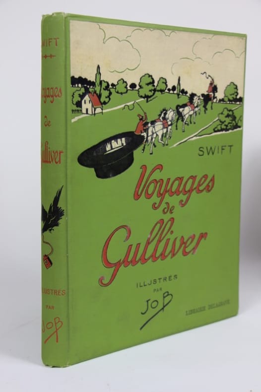 Voyages chez plusieurs nations reculées du monde par Lemuel Gulliver, d'abord chirurgien puis Capitaine sur différents vaisseaux. Nouvelle édition, avec de nombreuses illustrations, bandeaux, lettrines et culs de lampe dans le texte en noir et en couleurs de Poirson vol demi cuir à coins, 26x17, superbe exemplaire, tranche de tête dorée à l'or fin, 430pp . Couverture d'origine conservée, état neuf. Paris, Quantin, 1882/84
