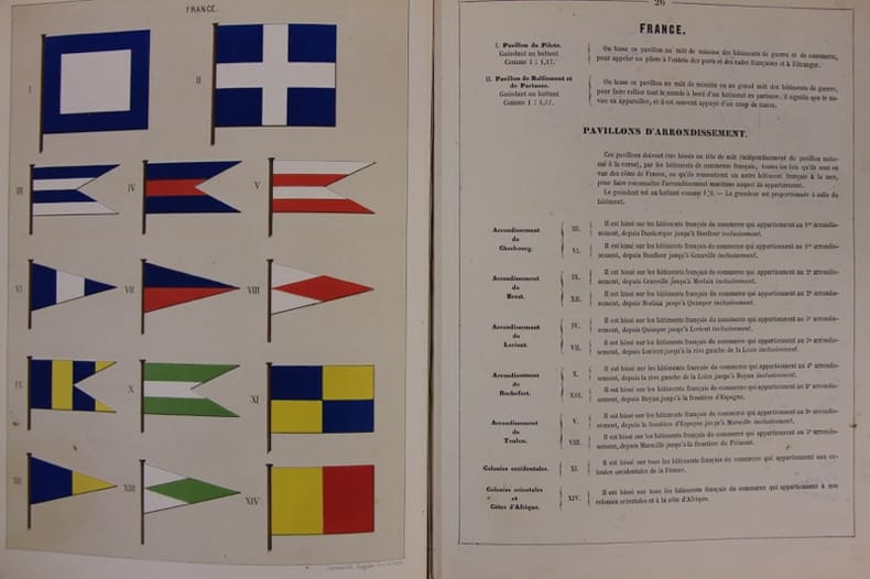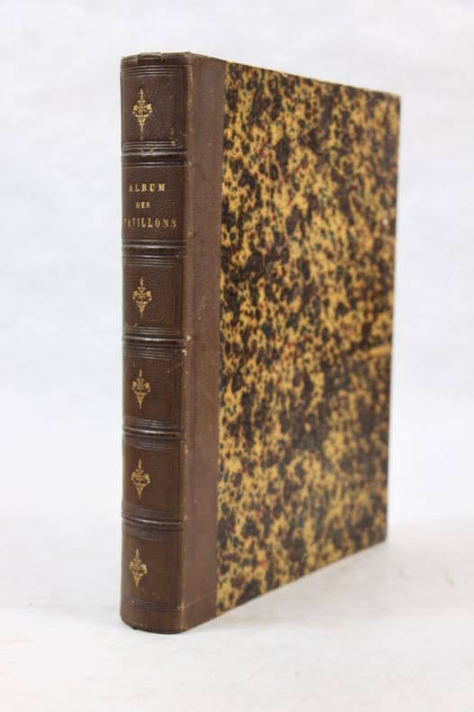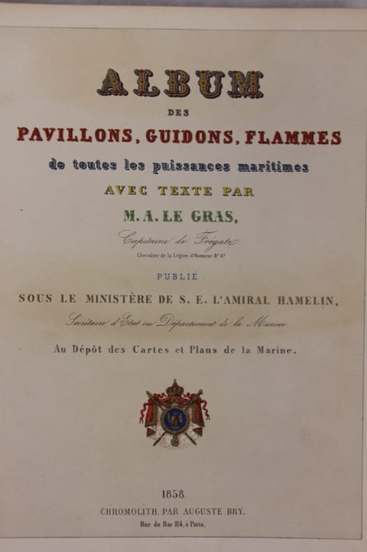Première et seule édition de cet album réunissant 526 pavillons, guidons & flammes de toutes les puissances maritimes du monde, chaque pavillon est accompagné d'une légende qui indique ses proportions et son emploi à bord des bâtiments) présentés sur 65 planches chromolithographiées contenant 526 pavillons. Exemplaire enrichi d’une lettre manuscrite du chef de cabinet du ministre de la Marine et des Colonies, datée 17 avril 1862. Bon état d’occasion