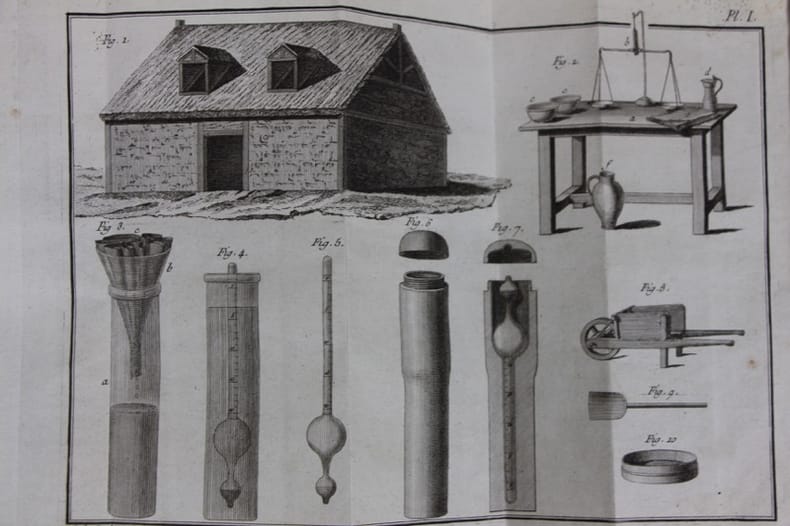 Première édition. Il est possible de fabriquer une beaucoup plus grande quantité de potasse, "dont le débit serait assuré, tant par les manufacturiers de salpêtre que par la Régie des poudres, qui prendrait toute celle que l'on pourrait faire; on croit utile pour l'Etat & pour les particuliers, de développer les principes d'un art qui n'est pas connu dans un royaume où il y en a tant d'autres que le génie de ses habitants a portés à leur perfection." Illustré par un tableau et 4 planches gravées. Très bel exemplaire. /// In-8 de (2), VIII, 84 pp. Basane fauve marbré, dos lisse orné. (Reliure de l'époque.) //// First edition. Instructions for production of salts, illustrated by 4 folding plate and a table. "Lavoisier's authorship is evident in the general style and conception of the treatise." Duveen, Lavoisier 213
