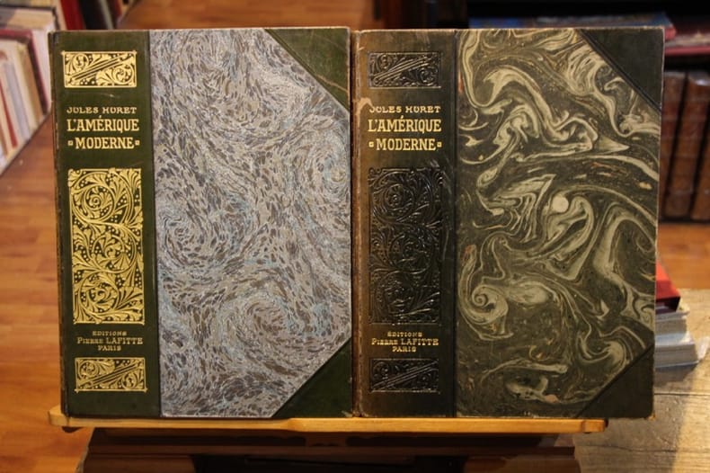 Journaliste, Jules Huret (1853-1915) multiplia les reportages à l'étranger : États-Unis (1903-1904), Allemagne (1906-1907 et 1909), l'Argentine (1911). Il passe pour l'inventeur du reportage moderne. L'Amérique moderne de Jules Huret est un témoignage fascinant sur les États-Unis au début du XXe siècle. L'auteur, journaliste français, nous livre ses impressions lors d’un voyage à travers le pays. À travers ses pages, Huret explore la dynamique sociale, économique et politique de l’époque, mettant en lumière l’essor industriel et les transformations urbaines. Il décrit avec enthousiasme le mode de vie américain, les innovations technologiques et l’esprit entrepreneurial qui imprègne la culture. Huret aborde également les questions de l'immigration et des inégalités sociales, offrant une vision nuancée des défis auxquels la société américaine fait face. Son style, mêlant reportage et réflexion personnelle, permet de ressentir l’effervescence de cette époque charnière. L’ouvrage se distingue par sa capacité à capturer l'essence d'un pays en pleine mutation, tout en faisant résonner des thèmes universels qui résonnent encore aujourd’hui. C'est une œuvre essentielle pour quiconque s'intéresse à l'histoire et à l'évolution des États-Unis. Complet deux volumes in-Folio demi cuir dos, reliures avec usures, 35x25cm, bel état intérieur, 240, 240 pages - plats et contre plats jaspés - ouvrage illustré de 180 planches hors texte en couleurs et en noir. Pierre Lafitte 1911