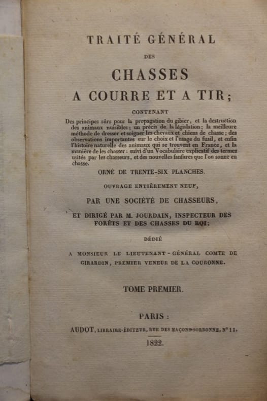 “Contenant des principes sûrs pour la propagation du gibier, et la destruction des animaux nuisibles ; un précis de la législation ; la meilleure méthode de dresser et soigner les chevaux et chiens de chasse ; des observations importantes sur le choix et l'usage du fusil, et enfin l'histoire naturelle des animaux qui se trouvent en France, et la manière de les chasser : suivi d'un vocabulaire explicatif des termes usités par les chasseurs, et des nouvrlles fanfares que l’on sonne en chasse.” Bon état d’occasion