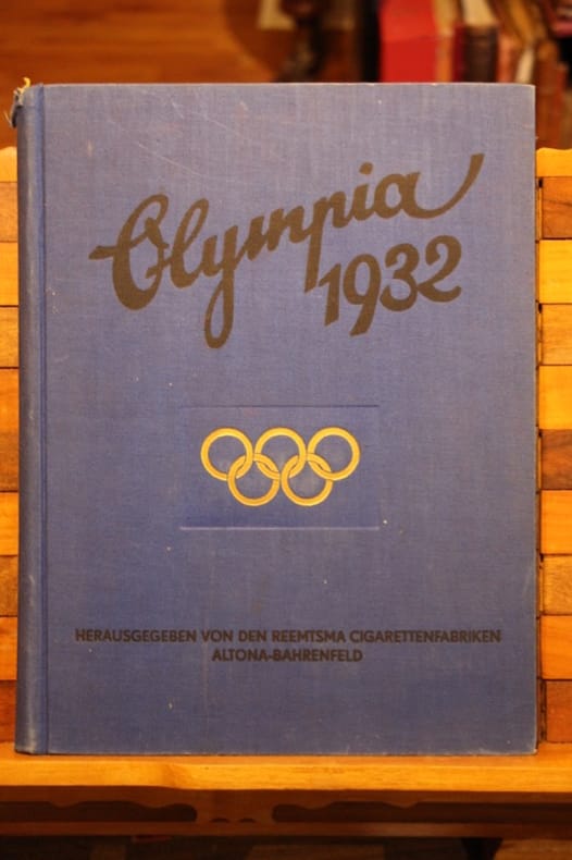 Altona-Bahrenfeld, Reemstma Cigarettenfabriken G.M.B.H. 1932 In-4. Cartonnage éditeur pleine toile bleu roi, dos muet, report du titre noir et de l’emblème olympique or sur le premier plat, 144 pp., photos et vignettes contrecollées en noir et blanc et en couleurs, tableau graphique dépliant en couleurs. Accroc en tête de dos, sinon bon exemplaire bien complet de ses vignettes.