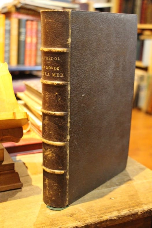 Edition originale revêtue d'une très décorative reliure du temps. L'exemplaire s'agrémente de 21 (sur 21) planches chromolithographiées montées sous serpentes, ainsi que de 200 figures dans le texte par Pierre Lackerbauer. ''Frappé d'admiration à la vue du tableau grandiose des océans, touché du magique spectacle de la vie des eaux, l'auteur peint ici le monde de a mer dans son luxe et dans ses agitations. Il décrit les êtres avec originalité et poésie, il expose leurs développements et métamorphoses, leurs ruses t leurs industries, leurs combats et leurs amours, insistant sur les produits de la mer, sur l'abondance de ses fruits, sur l'utilité de sa culture, décrivant également les organismes''. (in Préface). Petites altérations superficielles éparses affectant la reliure. Quelques claires rousseurs dans le corps d'ouvrage. Du reste, belle condition.