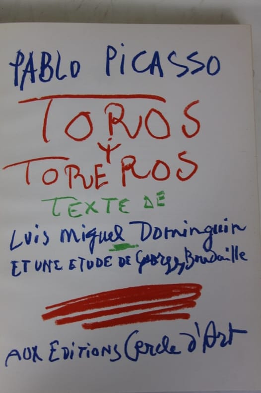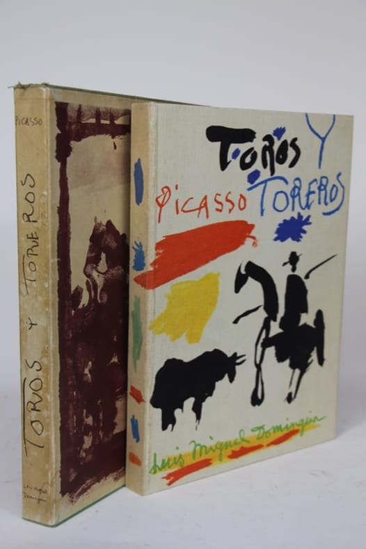 BARCELONA. EDITORIAL GUSTAVO GILI S. A. 1961. GRAND IN-4 (28 X 38,5 X 4 CENTIMETRES ENVIRON) DE 30 + (2) PAGES DE TEXTE ET 136 PAGES D'ILLUSTRATIONS, RELIURE DE L'EDITEUR PLEINE PERCALINE BEIGE A LA BRADEL, ENTIEREMENT ILLUSTREE EN COULEURS, SOUS ETUI CARTONNE ENTIEREMENT ILLUSTRE EN BISTRE. LES ILLUSTRATIONS, DONT 16 EN COULEURS REPRODUISENT 3 CARNETS DE DESSINS DE PABLO PICASSO CONSACRES A LA TAUROMACHIE. PREMIERE EDITION EN LANGUE ESPAGNOLE. QUELQUES ROUSSEURS EXTERIEURES SUR LA PERCALINE ET L’ETUI, SINON BEL EXEMPLAIRE.