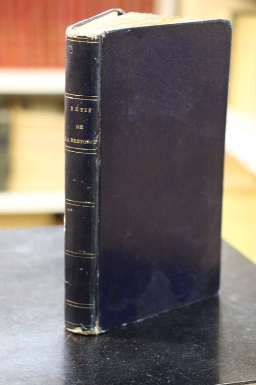 Ouvrage de référence sur Rétif de la Bretonne, sa vie et son oeuvre. Premier ouvrage du genre publié en 1854 (remis en vente en 1858) et qui précède de 20 ans la bibliographie du Bibliophile Jacob (Paul Lacroix) publiée en 1875 chez le libraire Auguste Fontaine. Ce sont ces deux ouvrages qui ont redonné à Rétif ses lettres de noblesse parmi les bibliophiles et amateurs qui avaient oublié depuis longtemps cet auteur curieux et digne du plus grand intérêt. Fils de paysans de l'Yonne, devenu ouvrier typographe à Auxerre et Dijon, Nicolas Restif de La Bretonne s'installe à Paris en 1761 : c'est alors qu'il commence à écrire. Il a une vie personnelle compliquée et est sans doute indicateur de police. Polygraphe, il fait paraître de très nombreux ouvrages touchant à tous les genres, du roman érotique (L'Anti-Justine, ou les Délices de l'amour) au témoignage sur Paris et la Révolution (Les Nuits de Paris ou le Spectateur nocturne, 1788-1794, 8 volumes) en passant par la biographie avec La Vie de mon père (1779) où il brosse un tableau idyllique du monde paysan avant la Révolution avec la figure positive de son père. Il a également touché au théâtre sans grand succès. Cherchant constamment des ressources financières - il mourra d'ailleurs dans la misère -, il écrit aussi de nombreux textes pour réformer la marche du monde. Cependant l'œuvre majeure de Restif de la Bretonne est sa vaste autobiographie, Monsieur Nicolas, en huit volumes échelonnés entre 1794 et 1797. Ce livre fleuve se présente comme la reconstruction d'une existence et expose les tourments de l'auteur/narrateur comme à propos de la paternité - le titre complet est Monsieur Nicolas, ou le Cœur humain dévoilé -, mais témoigne aussi de son temps et constitue une source très abondante de renseignements sur la vie rurale et sur le monde des imprimeurs au XVIIIe siècle. C'est aussi un philosophe réformateur pénétré de rousseauisme qui publie des projets de réforme sur la prostitution, le théâtre, la situation des femmes, les mœurs, et un auteur dramatique. (source Babelio). Très bon exemplaire, sur grand papier le plus rare, bien relié à l'époque, avec envoi autographe, de ce livre qui doit avoir sa place dans toute bibliothèque rétivienne.