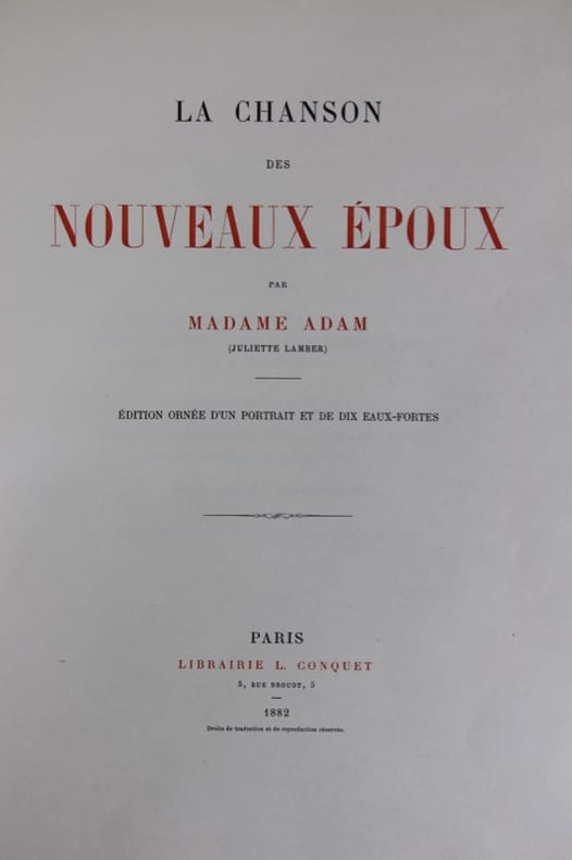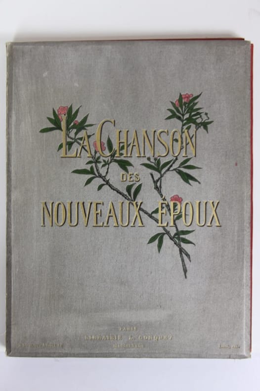 Librairie L. Conquet 1882 In-folio, broché sous portefeuille percaline verte, plats biseautés, premier plat orné d’un décor floral polychrome, titre dorée signé Engel, rabats toilé à lacets, couverture illustrée en couleurs, 62 pp, 1ff. de table, portrait frontispice et 10 hors texte. Couverture un peu ternie, fendillée en tête et en pied, par ailleurs très frais.