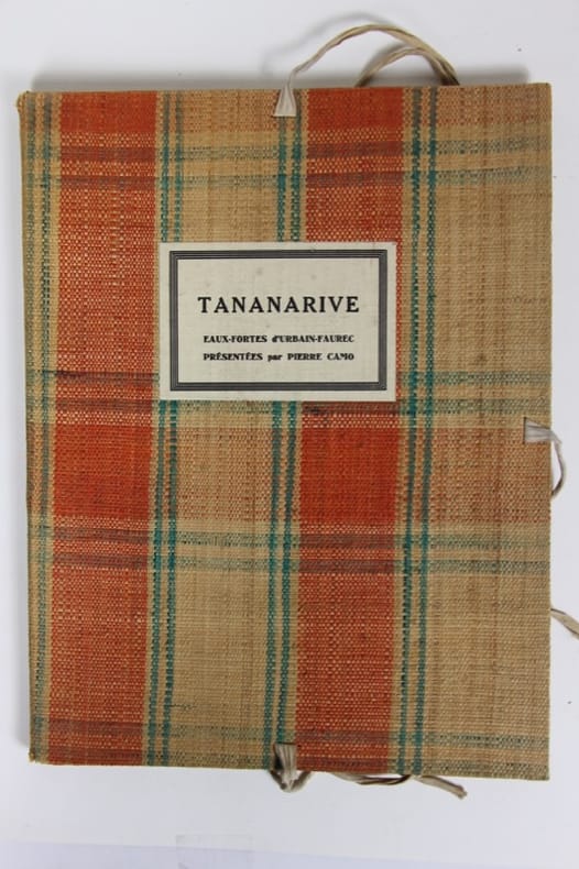Tananarive, Imprimerie Industrielle 1933 In 4 en feuilles, couverture rempliée et portefeuille pleine toile tissée décorée à lacets, ; 5 ff. n. ch.- 11 eaux-fortes num. et signées sous serpentes légendées - 2 ff. de table. Bel exemplaire.