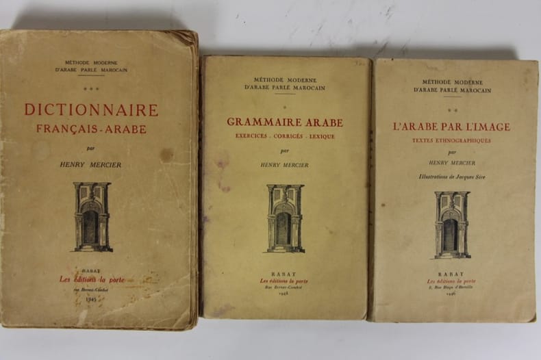 Les éditions de la Porte 1945 3 volumes in-8 brochés, 204- XIII- 312-III- 413 pp. Couvertures ternies et mors fendillés pour la Grammaire et le Dictionnaire d’un format augmenté et sur deux colonnes. Figures dans le texte pour l’Arabe par l’image, en partie non coupé.