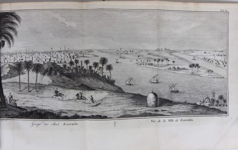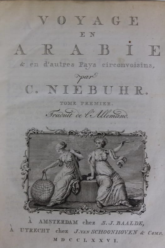 Premier volume seul de la première édition française. C'est en tant qu'astronome, cartographe et trésorier de l'expédition commanditée par le roi du Danemark que le jeune Allemand Carsten Niebuhr (1733-1815) découvrit ces contrées. Observateur précis et attentionné, doué de l'instinct du savant et d'une grande probité morale, il enregistrait les résultats de ses observations avec une conscience rigoureuse et un grand désir de représenter la réalité. Ses œuvres ont longtemps été des classiques de la géographie, l'Ethnologie, et l'archéologie de la plupart des lieux qu'il parcourut en Arabie. Le premier volume porte sur l’Egypte et le Yemen, pays inviolé appelé alors l'Arabie heureuse. Etat correct d’occasion