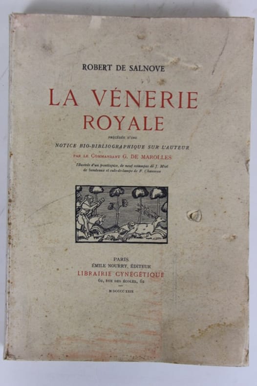 Emile Nourry, Librairie Cynégétique Paris 1929 Grand in-8 ( 290 X 200 mm ) de XXIV-297 pages, broché sous couverture illustrée imprimée comme la page de titre en rouge et noir. Bel ouvrage illustré d'un frontispice, de neuf estampes, dont 2 doubles, de J. MIEL, et de bandeaux et culs de lampe de F. CHAUVEAU. Contient les chasses du cerf, du lièvre, du chevreuil, du sanglier, du loup et du renard. Avec la manière délever les chiens et un traité des remèdes pour leurs maladies. Dictionnaire des chasseurs in-fine. Louvrage est précédé dune notice bio-bibliographique par le Commandant G. de Marolles. Thiébaud, 826. Un des 1000 exemplaires numérotés à la presse sur Alfa Satiné. Quelques rousseurs, bel exemplaire.