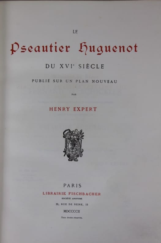 Tirage limité à 125 exemplaires sur Hollande. Chaque exemplaire souscrit porte le nom du souscripteur. Celui-ci, N° 28, M. Louis Panassié à Paris. Superbe reconstitution d’après les éditions princeps, avec la notation originale, de ce bréviaire de la foi calviniste, recueil des 150 psaumes de David, traduits en français par Clément Marot et Théodore de Bèze et mis en musique. Le musicologue Henry Expert (1863-1952) l’accompagne de la version latine-française extraite des Commentaires de Calvin. Une importante contribution à l’histoire de l’art musical. Bon état d’occasion