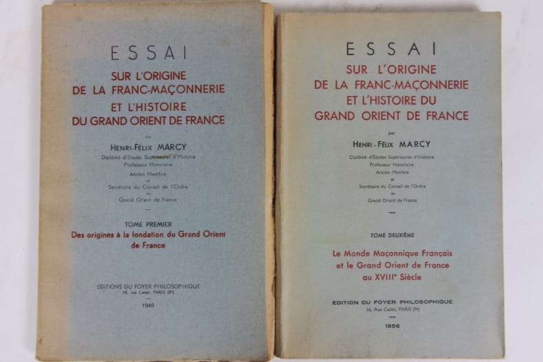 Editions Du Foyer Philosophique Paris 1949-1956 2 volumes in-8 ( 240 X 155 mm ) de 173 et 368 pages, brochés sous couvertures imprimées. EDITION ORIGINALE. Dos muets passés. Bon exemplaire. - Tome 1: Des origines à la fondation du Grand Orient de France.- Tome 2: Le Monde Maçonnique Français et le Grand Orient de France au XVIIIe siècle.