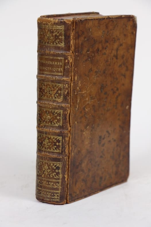 Paris, Hôtel Serpente, 1785, in-8, XVI-[4]-624-[4] pp, 10 pl. depl, veau marbré de l'époque, dos à nerfs et fleuronné, pièce de titre grenat, tranches rouges, Les 10 planches gravées sur cuivre représentent diverses expériences et les principales machines électriques utilisées à cette époque. Seconde édition de cet ouvrage, paru pour la première fois en 1781, qui résume les théories du XVIIIe siècle sur l'électricité. L'auteur (1730-1810), disciple de l'abbé Nollet, évoque l'utilisation de l'électricité en médecine et la théorie de Benjamin Franklin. Cachets de l'Institut catholique de Paris, notamment apposés au revers de planches (légers reports au recto). Coiffe supérieure arasée, coins émoussés, feuillets jaunis. Wheeler Gift n° 505a. The Bakken, p. 107. Couverture rigide