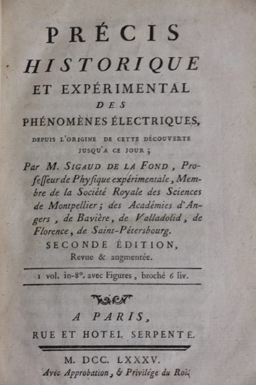 Paris, Rue et Hôtel Serpente, Paris, Rue et Hôtel Serpente1781 ; in-8, veau fauve marbré, dos orné, tranches rouges. (Reliure de l’époque) XVI pp., 742 pp., 9 planches dépliantes.ÉDITION ORIGINALE. Sigaud de La Fond (Dijon 1740 - Bourges 1810) avait suivi dans sa jeunesse les leçons du physicien Nollet. Traité très complet sur les expériences électriques : les travaux de Gibert, les machines électriques de Nollet, Nairne, Gordon, Chaulnes, Franklin, les travaux de Wall, Grey, Dufay, Watson, les électrometres de Nollet, Henley, Canton, l’expérience de Leyde et la théorie de Franklin, etc.Les planches gravées par Sellier montrent les machines électriques.- Poggendorff II, p. 927 - Mottelay. Bibliogr. history of electricity p. 280 (qui ne connaît que l’édition de 1785) - Wheeler Catalogue 505 - D. S. B. p. 427.Bel exemplaire.