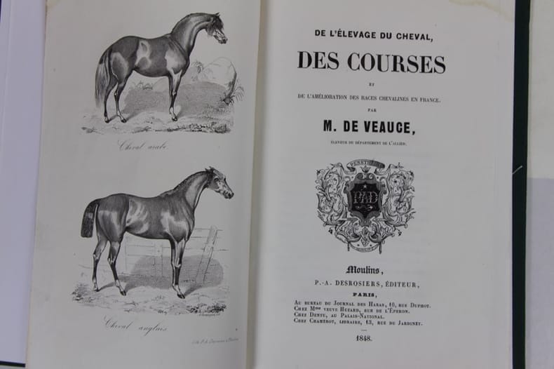 Riche propriétaire terrien, l’auteur (1820-1884) fut maire de Veauce et député de l'Allier. Il créa dans sa propriété de Veauce un élevage de pur-sang. Les planches représentent 2 types de chevaux et la distribution de bâtiments et enclos d'élevage. Bon état d’occasion