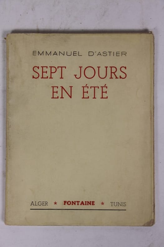 Edition originale, un des 150 exemplaires numérotés sur registre. Les "Sept jours en été" sont ceux de la clandestinité à Paris : Chaque jour illustre un moment résistant : le rendez-vous avec les camarades dans un environnement où chaque passant peut être un espion, la ruse pour échapper aux filatures, l'annonce que l'ami a été fusillé pour actions de sabotage, la résistance de la vieille dame qui l'héberge en faisant de faux-papiers, le couvre-feu à Paris où il peine à se retrouver, les contrôles auxquels il échappe. Journaliste, Emmanuel d'Astier de la Vigerie prend, en novembre 1940, la direction d'un petit groupe d'intellectuels décidés à agir, parmi lesquels Lucie Aubrac et Jean Cavaillès. A la fin de février 1941, il entre en clandestinité et fonde le journal Libération qui paraît pour la première fois en juillet 1941. En novembre 1943, il est nommé commissaire à l'Intérieur du Comité français de Libération nationale. Bon état d’occasion