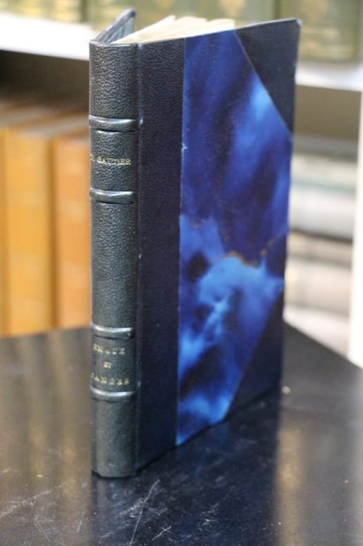 Paris, Poulet-Malassis et de Broise, Paris, Poulet-Malassis et de Broise1858 ; in-12, demi-maroquin outremer, coins, nerfs, fleurons dorés, tête dorée. (Reliure de l’époque) Frontispice, titre en rouge et noir, 230 pp., 1 f. avec le caducée.Edition tirée à 1000 exemplaires, 5 sur vergé plus quelques rares exemplaires sur vélin fort.C’est la troisième édition du recueil, les deux premières ayant paru chez Didier en 1852 et 1853. L’édition Malassis, en PARTIE ORIGINALE contient 27 poèmes, soit 9 de plus que la première de 1852, sans reprendre les 2 inédits de 1853. Les pièces nouvelles sont : Odelette anacréontique, Fumée, Apollonie, L’Aveugle, Lied, Fantaisies d’hiver, la Source, l’Art, Buchers et Tombeaux.Le frontispice dessiné et gravé à l’eau-forte par Emile THEROND (né à Saint-Jean du Gard en 1821) présente Gautier dans un médaillon avec un large encadrement d’orfèvrerie. Au sujet de ce portrait, voir Boucher. Icon. de Th. Gautier n°65: “La délicatesse que l’artiste a su mettre dans la composition de ce frontispice mérite éloge, c’est bien de ce genre un des plus heureux portraits de Gautier qu’on ait représenté, plein de finesse, de vérité et charmant à la fois. Pour symboliser l’oeuvre, Thérond a imaginé un cadre formé d’arabesques... dans lesquelles sont serties des pierres précieuses étincelantes et où viennent s’encastrer des émaux d’un ton doux, l’un égyptien, l’autre assyrien... L’artiste a dû s’inspirer pour le portrait d’une des photographies de Nadar...”Thérond est également l’auteur des nombreux bandeaux, fleurons et culs-de-lampe gravés sur bois dans le volume.Launay 64 - qui cite une lettre de Gautier à E. Feydeau publiée dans les Souvenirs intimes de ce dernier en 1874 : “Cet “étourdi de Poulet-Malassis (pullus gallinceus male sedens) a copié pour Emaux et Camées la première édition, de façon qu’il a sauté deux pièces qui sont ajoutées à la seconde : les Accroche-coeurs et les Néréides. C’est adroit pour un recueil complet! Il n’a pas mis non plus la pièce intitulée l’Art à la place indiquée : elle devrait venir après Bûchers et Tombeaux et clore le volume dont elle résume l’idée. Sauf cela, c’est parfait!” Th. Gautier était en Russie lorsque Malassis imprima ce livre, il ne put donc en surveiller la correction...Lonvenjoul II 147-48 (qui donne des lettres de Gautier à Malassis au sujet de ce volume) - Clouzot 72: “le volume est tiré sur excellent papier vélin légèrement azuré ou crème” - Vicaire III 910 - Tourneux. Gautier 8 - Jouanne 110.En 1863 le libraire Pincebourde écoula les derniers exemplaires de l’édition avec un nouveau titre à son nom.Bel exemplaire bien relié.GAUTIER (Pierre-Jules-Théophile).Le « poète impeccable » auquel Baudelaire dédia les Fleurs du Mal, fut un des auteurs de premier rayon de Poulet-Malassis. L’éditeur, hélas, ne fit pas fortune avec les livres de Gautier qui se vendaient mal. Mais le portrait du poète d’Emaux et Camées figurait en bonne place dans la luxueuse librairie du passage Mirès, parmi les médaillons peints des « auteurs-maisons ». Gautier et Malassis ne furent sans doute jamais intimes, car sans idées politiques précises, Gautier s’était peut-être un peu trop facilement adapté au Second Empire. Il faisait figure de personnage officiel, surtout dans l’entourage de la princesse Mathilde, qui le nomma son bibliothécaire en 1868. Poulet-Malassis, exilé alors à Bruxelles, n’a jamais fréquenté le salon de la cousine de Napoléon III, ces deux Bonaparte que liaient un attachement et un dévouement inaltérables. Gautier est mort en 1872, six ans avant Malassis.