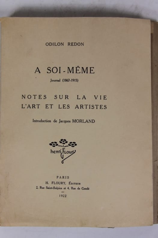 Édition originale, un des 125 exemplaires num. sur pur fil avec une eau-forte originale d'Odilon Redon sur japon nacré. Elle est ornée d’un portrait photographique de l’artiste par H. Manuel. Odilon Redon justifie ainsi cet ouvrage dans ses premières pages : “J'ai fait un art selon moi. Je l'ai fait avec les yeux ouverts sur les merveilles du monde visible, et, quoi qu'on en ait pu dire, avec le souci constant d'obéir aux lois du naturel et de la vie. [...] Les notes que je formule ici aideront plus à la compréhension de cet art que tout ce que je pourrais dire de mes concepts et de ma technique. L'art participe aussi des événements de la vie. Ceci sera la seule excuse de parler uniquement de moi.” Bon état d’occasion