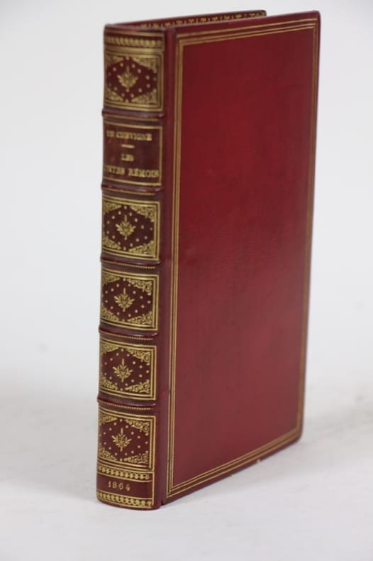 Paris, Michel Lévy, 1864. 12°. 22 f. n.ch. 320 p. Avec 2 portraits gravés, dessinés par Foulquier, gravés par Buland, 35 vignettes de Meissonnier et 20 vignettes de Foulquier et une photo. Cette édition contient 4 contes nouveaux illustrés par FOULQUIER. (Vicaire II, 389) Reliure demii maroquin vert, dos a cinq nerfs bordé de filets or, fleurons sur le dos, tranche de tête dorée.