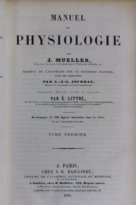 Deuxième édition, revue et annotée par Littré, du premier traité moderne de physiologie, marquant une étape importante dans son essor. Bon état d’occasion