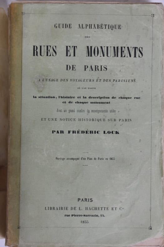 Publié à l’occasion de l’exposition universelle. La situation, l’histoire et la description de chaque rues et de chaque monuments avec un grand nombre de renseignements utiles, une notice historique sur Paris, une table de voies publiques et édifices supprimés, une liste des personnages dont la demeure est signalée. Peu courant. Bon état d’occasion
