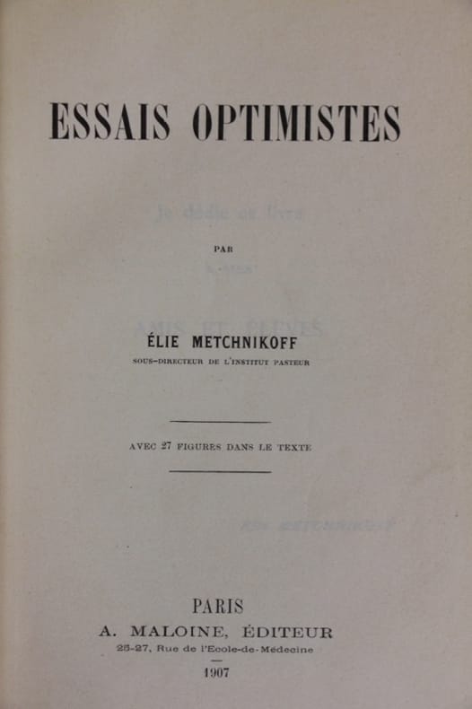 Essais et réflexions sur la prolongation de la vie, entre science et morale, insistant sur les règles l’hygiène et de régime alimentaire. L'auteur (1845-1916), zoologiste et biologiste russe, vint à Paris en 1887. Attaché au laboratoire de recherches de l'Institut Pasteur dont il deviendra le sous-directeur, il fit d'importantes découvertes (dont celle de la phagocytose) et partagea, en 1908, le Prix Nobel de médecine avec P. Ehrilch. Bon état d’occasion