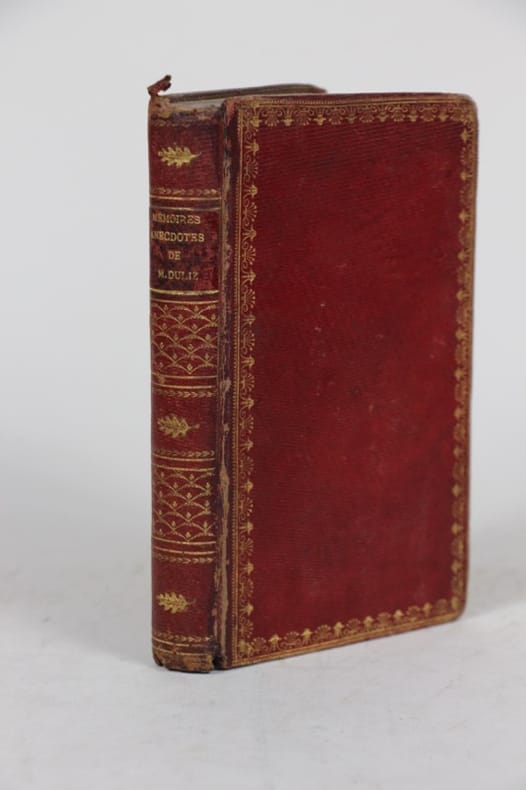 Londres, Londres, Chez Samuel Harding 1739 In-16, plein maroquin cerise peigné, dos lisse orné de petits fers encadrés de résilles et de roulettes dorés, plats encadrés d’une frise de palmettes dorées, contreplats encadrés d’une frise de grecques dorées, roulette en coupe, titre noir et rouge orné d’une figure, 206- 75 pp. Coiffe usée, coins émoussés, charnières sup. fendillée fragile. Légères mouillures éparses en pied.