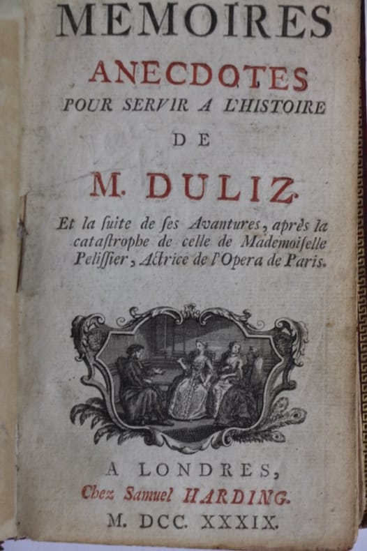 Intéressant recueil relatant les mésaventures d'un jeune banquier d'origine marrane, époux d'une demoiselle Henriquès et beau-frère d'un Pinto, venu de Hollande à Paris pour affaires au début du règne de Louis XV et qui y fut littéralement plumé par une actrice de l'Opéra. La pièce de Louis de Boissy, futur académicien et directeur du Mercure de France, est directement inspirée par le fait divers relaté par Desforges. Peu courant. Bon état d’occasion