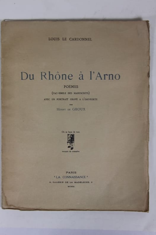 Tirée à 259 exemplaires numérotés, celui-ci hors-commerce sur Vergé antiqueLes neuf poèmes de Louis Le Cardonnel y ont été reproduits sur les manuscrits appartenant à Madame de Flandreysy, et huit d'entre eux sont inéditsBeau portrait gravé par l'un des plus grands peintres symbolistes
